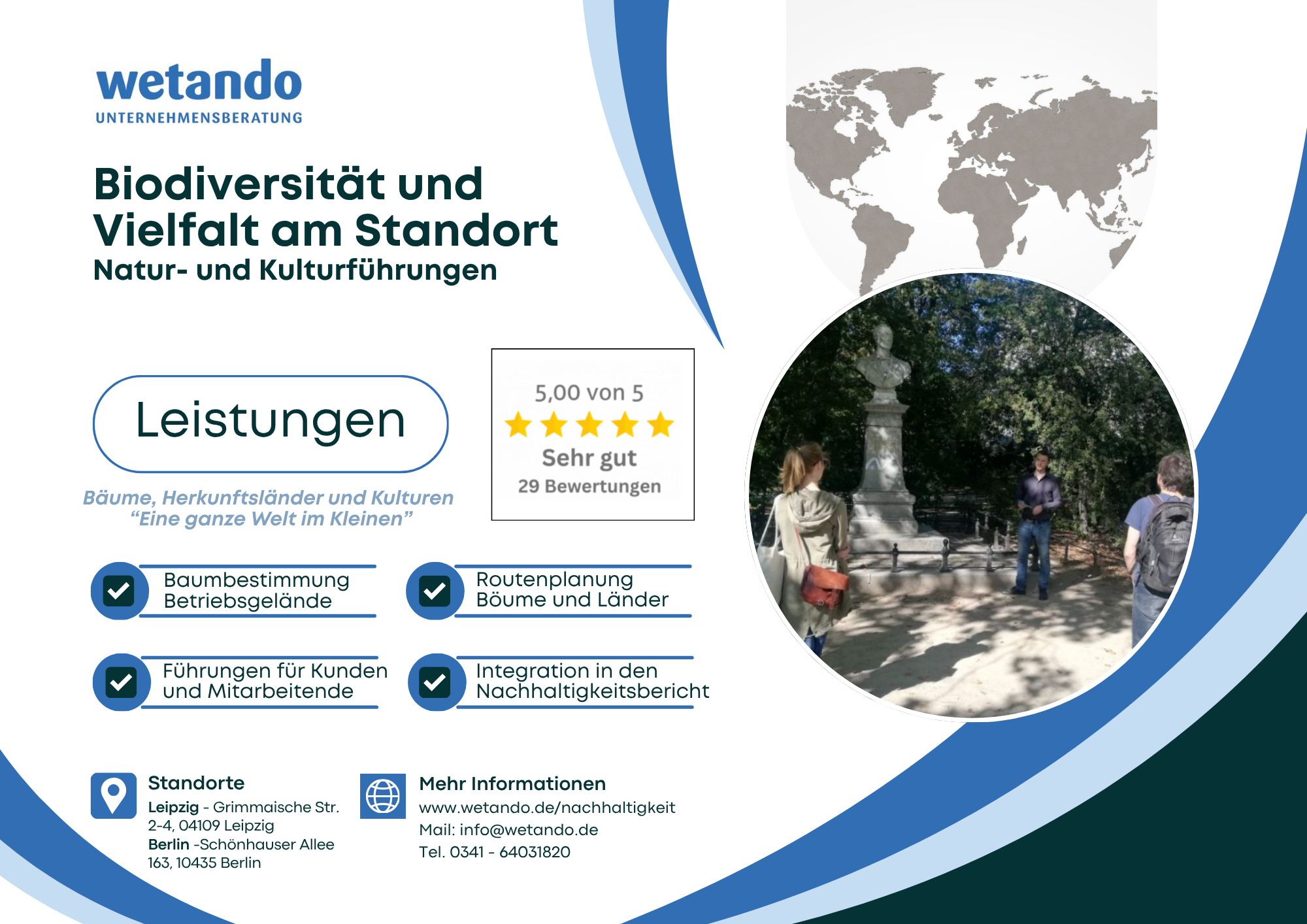 Bei dem Projekt verbinden wir Natur und Kultur seit Herbst 2018 in einem Live-Erlebnis. In unseren Führungen lernen Mitarbeitende und Kunden nicht nur die Bäume auf dem Betriebsgelände kennen, sondern auch deren Herkunftsländer – und damit auch die kulturellen Bezüge, die mit diesen Regionen verbunden sind. Das Projekt wird von uns auch in öffentlichen Parkanlagen umgesetzt. So werden bei einer Route 15–20 Bäume vorgestellt, z. B. Italienische Pappel, Holländische Linde, Französischer Ahorn oder eine Schwedische Mehlbeere.